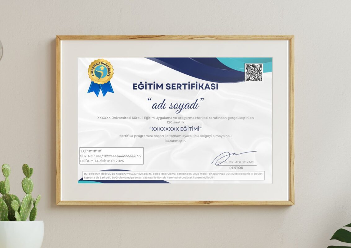 - Transkript ve İçerik Belgesi: Eğitim not dökümü ve içerik belgesi, altın varak çerçeveli krem kalın A4 kağıdına renkli olarak basılarak adresinize kargoyla gönderilir.